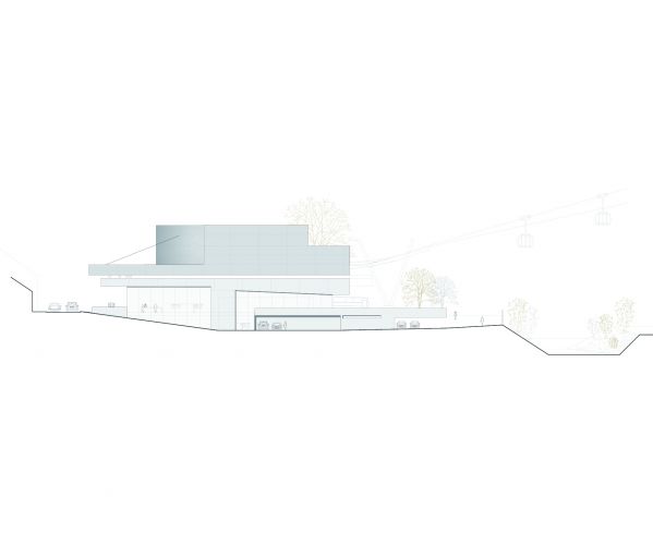 Pragmatisch betrachtet ist mehreren Gründen (aus brandschutztechnischen und auf Grund der Lärmbelästigung) ein Massivbau sinnvoll. Die Position der Bergbahn an der Hauptstraße liegt an einer räumlich beengten Stelle. Zur optimalen Leitung der Personenströme und um einen übersichtlichen und großzügigen Platz zu gewinnen, wird das Erdgeschoß so weit wie möglich von Nutzungen und Gebautem frei gehalten.