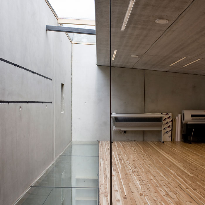 In der neu transformierten Innsbrucker Stadtvilla von 1914, hatte Daniel Fügenschuh 2005 sein eigenes Büro- und Wohnstudio eingerichtet. Im Laufe der Zeit wurde der Platzbedarf größer und er entschloss sich sein Büro zu vergrößern indem er im Garten der Villa unterirdisch ein neues Gebäude plante. Nach Fertigstellung des Gebäudes wurde der Garten wieder in den ursprünglichen Zustand gebracht. Nur ein Oberlichtband schneidet in den Rasen ein und bringt zusätzlich zur Belichtung durch die südliche, extensive Glasfassade, auch im hinteren Bereich natürliches Licht in den Raum. Der 5-6 Meter hohe Raum wurde mit vorgefertigten Sichtbetonelementen konstruiert. In Verbindung mit dem hellgrauen Teppichboden bekommt der Raum den formalen Ausdruck einer monolithischen Haut, die sich einseitig zur Stadt öffnet und damit eine Lücke in der Landschaft definiert. Stiegen und Galerie wurden aus lokaler Lärche gefertigt, was zum warmen Ambiente beiträgt. Die Kombination aus der industriellen Konstruktion mit der qualitativ hochwertigen Glasfassade, den Büromöbeln und der Beleuchtung geben dem Raum Ateliercharakter. Unter der Erde zu bauen erlaubt die Dämmung zu halbieren, ohne eine Verschlechterung des U-Wertes. Photovoltaik Zellen produzieren mehr Elektrizität als in diesem Passivhaus benötigt wird.