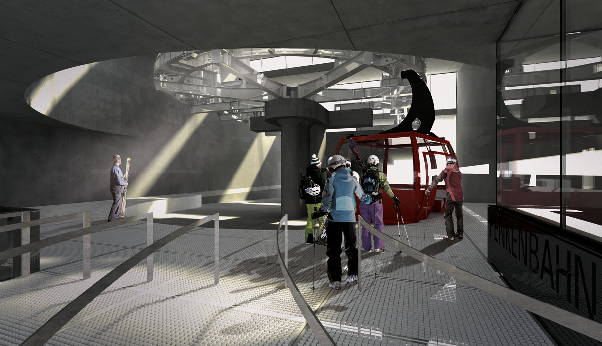 Das Obergeschoss entspricht einem Bahnhof. Hier wird über die Öffnungen im Dach die Bahntrasse in Szene gesetzt. Die Gebäudehülle bildet mit seinen glatten Betonoberflächen einen Hintergrund für die beeindruckende Konstruktion der neuen Seilbahntechnik, die dadurch besser wahrnehmbar wird. Die Lichtführung über das Dach verstärkt diese Absicht. Der Ausblick auf die bevorstehende Bergfahrt sowie das Ankommen in der Talstation am Ende des Ausflugs wird durch das Öffnen des Dach der Halle in Richtung Seilbahnstrecke entsprochen.