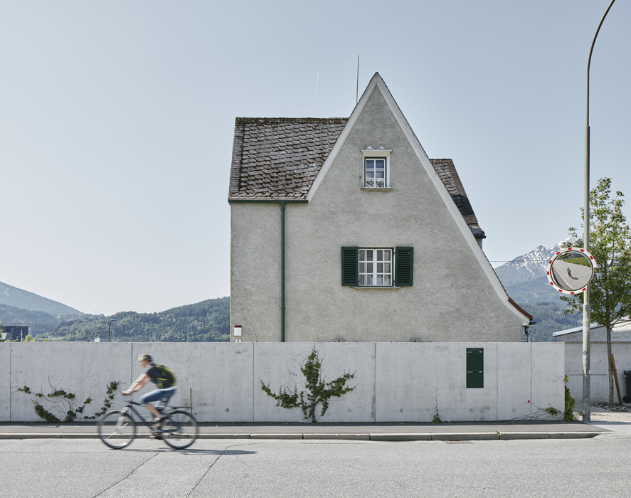 The site is located on a higher level above innsbruck on the edge of a drop in the landscape following the Inn valley. It is surrounded by two streets forming a pointed triangle towards the city center. One street following promenade like the terrain in direction to the sunset the other connecting the city with the higher positioned neighborhood and former village of Hötting. The design acts as a landmark at this point in town through an intelligent modulation of the massing of the little villa through its two pitched rooftops. By moving some of the peak like volumes off center the roof slope cuts in either one level only or two levels forming a cute object with four different characteristic facades.